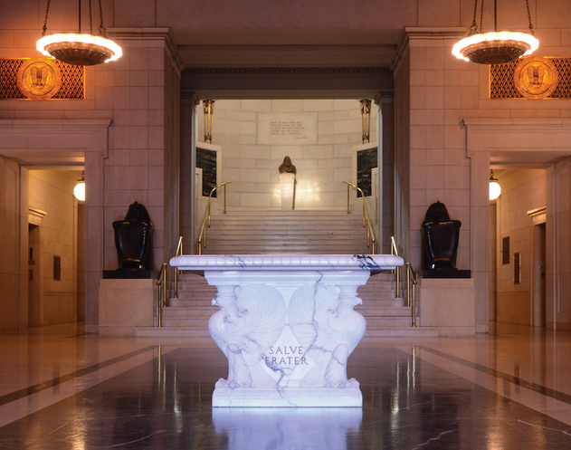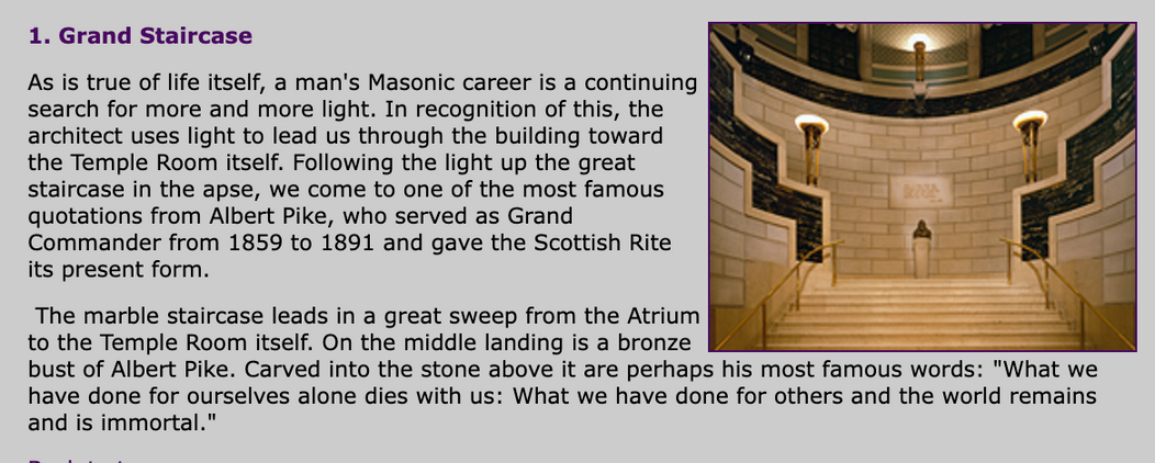 “As is true of life itself, a man's Masonic career is a continuing search for more and more light. In recognition of this, the architect uses light to lead us through the building toward the Temple Room itself. Following the light up the great staircase in the apse, we come to one of the most famous quotations from Albert Pike, who served as Grand Commander from 1859 to 1891 and gave the Scottish Rite its present form.” (Emphasis mine)